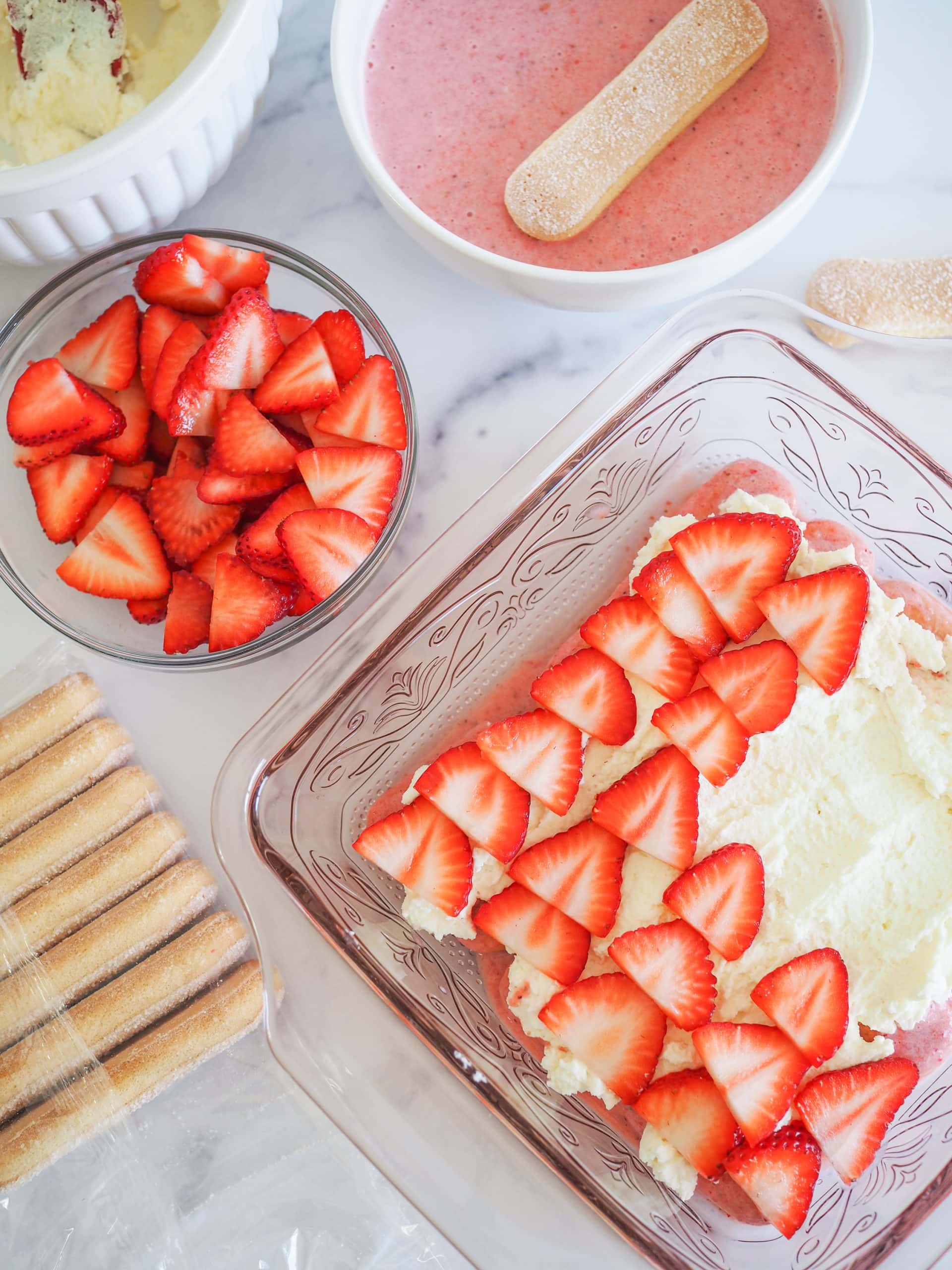 Po pirmojo „Lady Fingers“ sluoksnio yra keptuvės apačioje, atsargiai paskleiskite „Mascarpone“ kremo mišinį ant „Lady Finger“ sausainių viršaus. Tada pridėkite supjaustytų braškių sluoksnį.